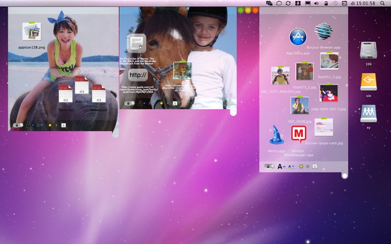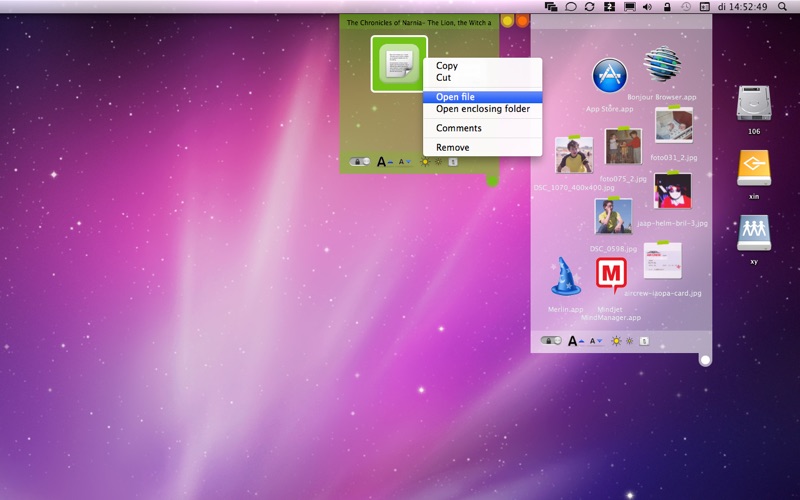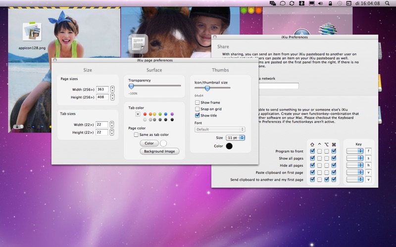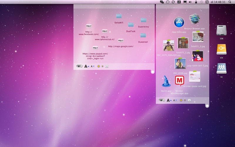 When iXiu is started, it will create a new panel below the menubar on the right side of your screen. This panel will appear when the mousepointer is moving above its tab. On this panel you can drop or paste anything you want. With a right-click on the panel or one of its icons, it will show a contextual menu with several options. Or simply double-click on an icon to open your browser or another application associated with the data. Every panel can have its own style. So, be creative and define the ultimate look of your pasteboard and start clipping all your pictures, urls and snippets of data.