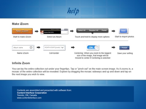 iZoomXpress turns your photos into an infinite photo mosaic. A mosaic is an image made from many tiny pictures. When you zoom into the mosaic, the tiny pictures turn out to be full size photos. An iZoom mosaic lets you keep zooming non-stop. You just need to select your photos and press a button. In a short moment, you will have a fun way to browse through your photos.