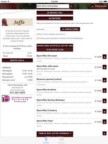 Met de Jaffa app bestel je veilig en snel de lekkerste spareribs, schotels, snacks en meer van Den Haag en omstreken. Direct online betalen via je eigen bank met iDEAL!