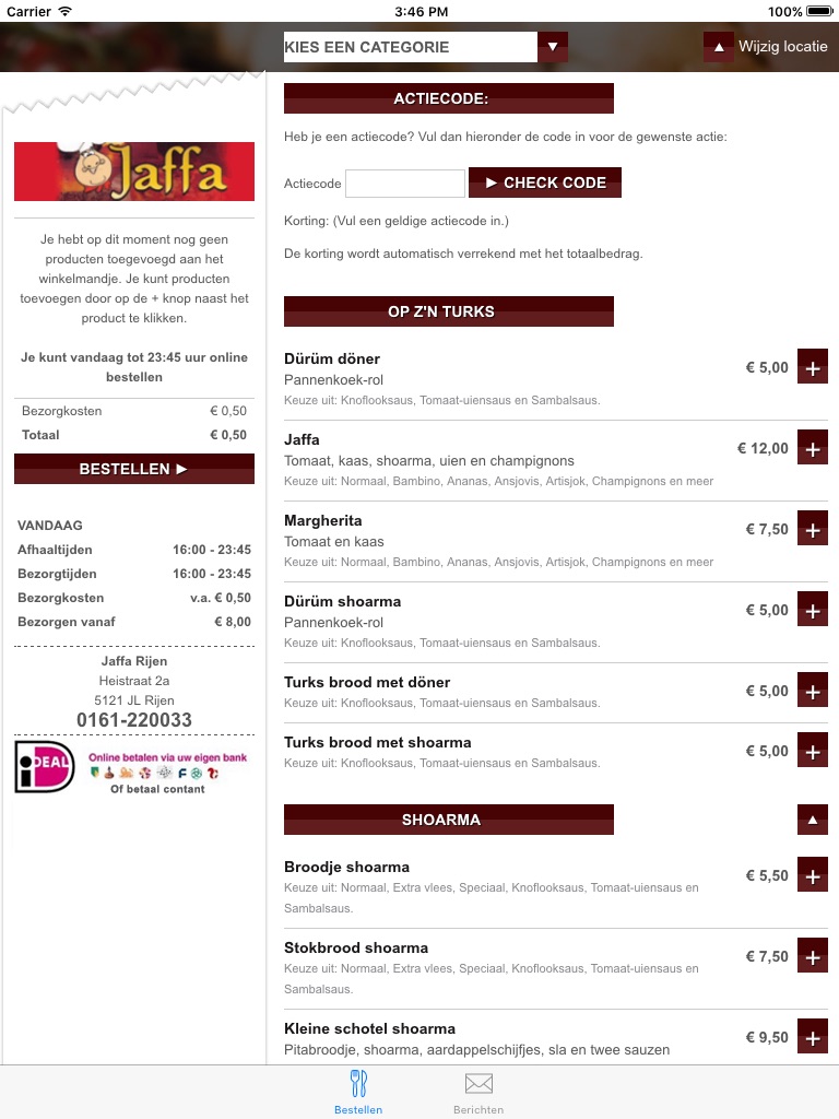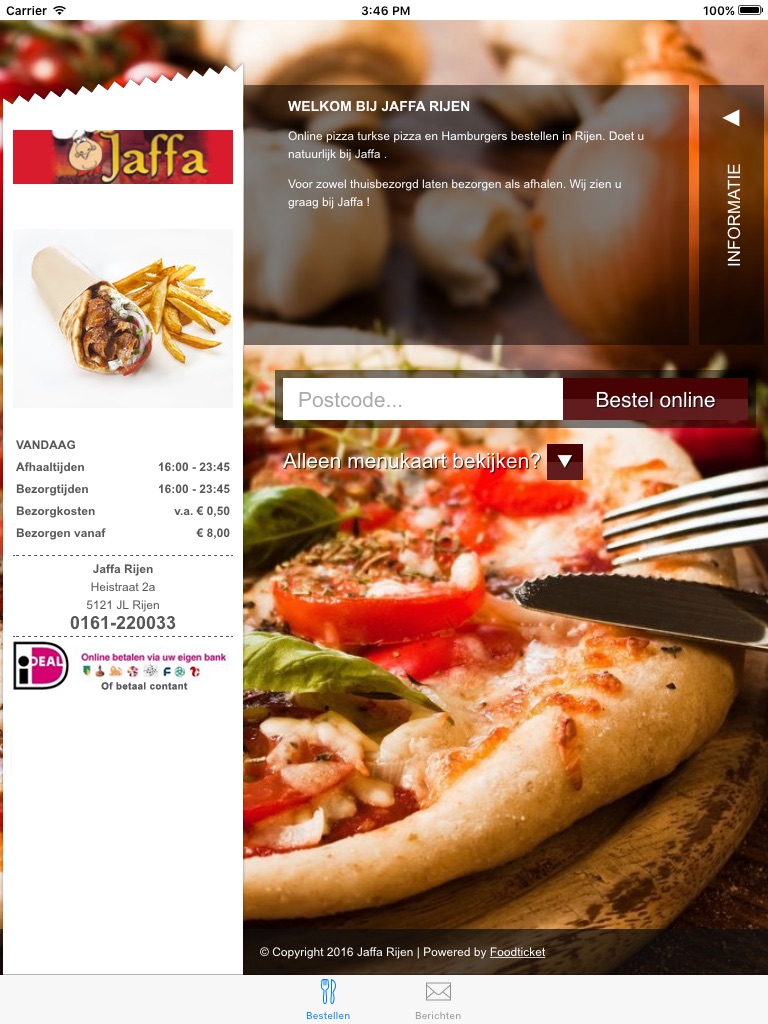 Jaffa al sinds 1990 een begrip voor Rijen en omstreken en nu met de nieuwe Jaffa app veilig en snel de lekkerste Pizza, Shoarma, Döner Kebab, Kapsalon en meer te bestelen vanuit de App. Direct online betalen via je eigen bank met iDEAL!, of toch liever contant betaling verrichtten? Download de gratis app en ervaar u smakelijke momenten bij JAFFA!