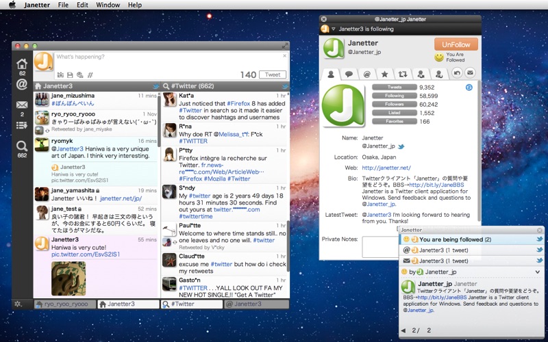 以前から無料版Janetterを使用していましたが、今回複数アカウントの管理をするためにProへ移行しました。 管理も非常に簡単で満足しています。 ただ起動時にアイコンが表示されないというバグがあります(MacOSX) その度にシステムごと再起動しなければならないので、早いバグ修正をお願いします。