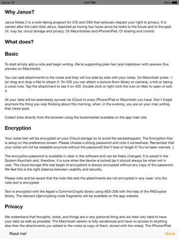 Please note that attachments are not encrypted in any case. The source code is available (MIT licensed) on GitHub under ilTofa/janusnotes.