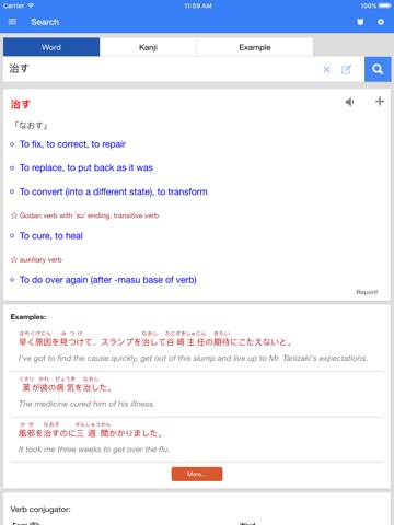 - Lookup word in japanese with kanji, hiragana, katakana, romanji and english with all information about reading, mean, example, synonym and relate word.