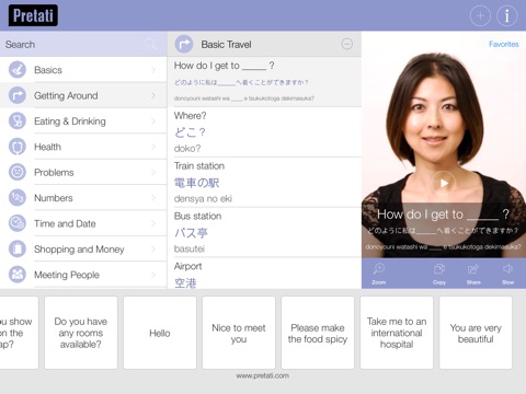 For each phrase, there is a video of a Japanese native speaker clearly pronouncing each word, plus the Japanese script and also the phonetic pronunciation of the phrase. For added convenience and ease of use, the phrases are grouped into categories for the most common travel situations including Getting Around, Eating & Drinking, Japanese expressions, Health, Problems, Numbers, Time and Date, Meeting People, Shopping, Money and even the necessary Japanese survival phrases. Other awesome features include the ability to playback each Japanese phrase in slow mode, mark favorites for quick reference and even copy the phrase to send via SMS or email to your friends in their native language. You can quickly share these to your social media circles too! While the app is primarily targeted towards travelers, it is also a great educational tool for those who desire to start learning the basics of the Japanese language in an easy, fast and fun way.