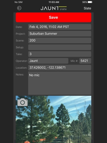 Jaunts virtual reality video slate and synchronization tool. The Jaunt Slate audio clapboard allows for post-production syncing of the audio and video streams captured from the camera for each shot. Jaunt Slate also displays a visual slate for each take, and automatically imports file data including project name, scene, take, camera, mic, notes, and photo on every shot.