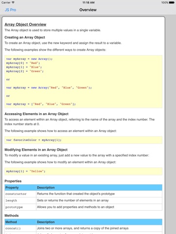 The JavaScript properties/functions/methods are categorized and searchable. Each detailed information screen contains a description, parameters, examples, browser compatibility, and more. In addition, most of the examples include the actual output.