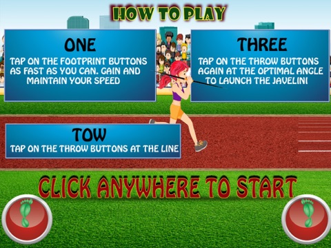 Javelin Babe is one of the exciting and fun game there is! This simple game is easy to get hooked on, you can see yourself playing all day, so make sure you eat the whole days meal before playing this game. Like all sports game, the goal is to win the race. To get the goal, you need to tap on the footprint buttons as fast as you can to gain and maintain your speed. Next, tap on the throw button to throw the javelin. This is one uncompicated game, but its not going to be that simple, Im telling ya! Through online you can check how you are doing compared to your friends, and the rest of the world.