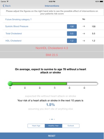 There are a number of different ways to show the patients’ risk, such as a ‘heart age’ screen (shows the age of the patients’ heart) and a ‘healthy years’ screen (shows the expected life years of a patient). These screens can highlight the steps, both lifestyle or drugs, that could be taken to reduce an individual’s risk of cardiovascular diseases (interventions).