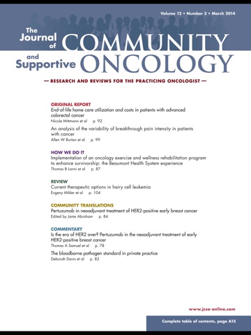 Community Oncology and The Journal of Supportive Oncology are merging to bring the best of both journals to clinical oncologists. The Journal of Community and Supportive Oncology—the journal of clinical issues in community practice, will offer expanded content focused on keeping readers up to date on the latest advances in new pathways and novel drugs, evolving use of therapeutic agents, the latest findings from patient-centered outcomes and symptom management, timely updates on reimbursement and regulatory issues that affect oncology practices.