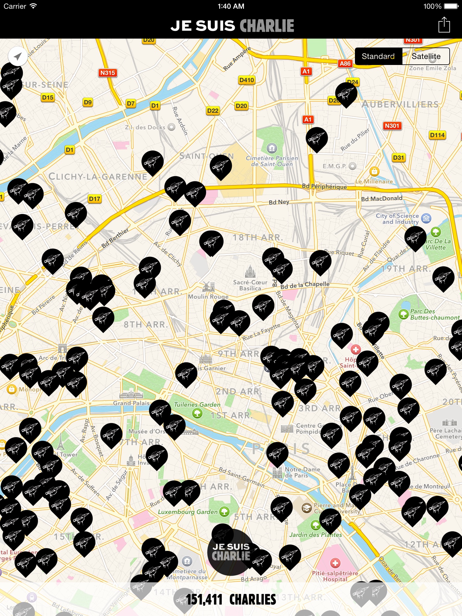 Because "Je suis Charlie" has become the symbol of freedom of speech whatever your beliefs, your country and your opinions, download the "I am Charlie" app and simply state where you stand on todays world map.