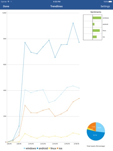 Analyze data from Twitter in real time with the help of the Jedox GPU Accelerator. Enter any keyword to display all associated localized tweets on the map. Optionally, refine the search to show only tweets of a specified time period or tweets containing pictures. Easily analyze the Top 100 keywords for every region. Finally, compare different keywords using trendlines. To enable those features, the app stores all localized tweets on the multidimensional Jedox Server, breaks them down to their relevant content, and analyzes geographic information in just a fraction of a second.