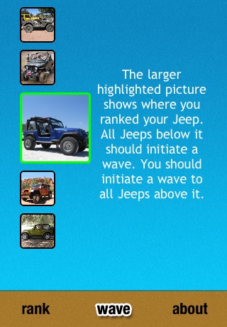 Jeep Wave is a tribute to all those Jeep Wrangler owners.This app is designed to calculate a Jeeps ranking to help figure out when to wave.