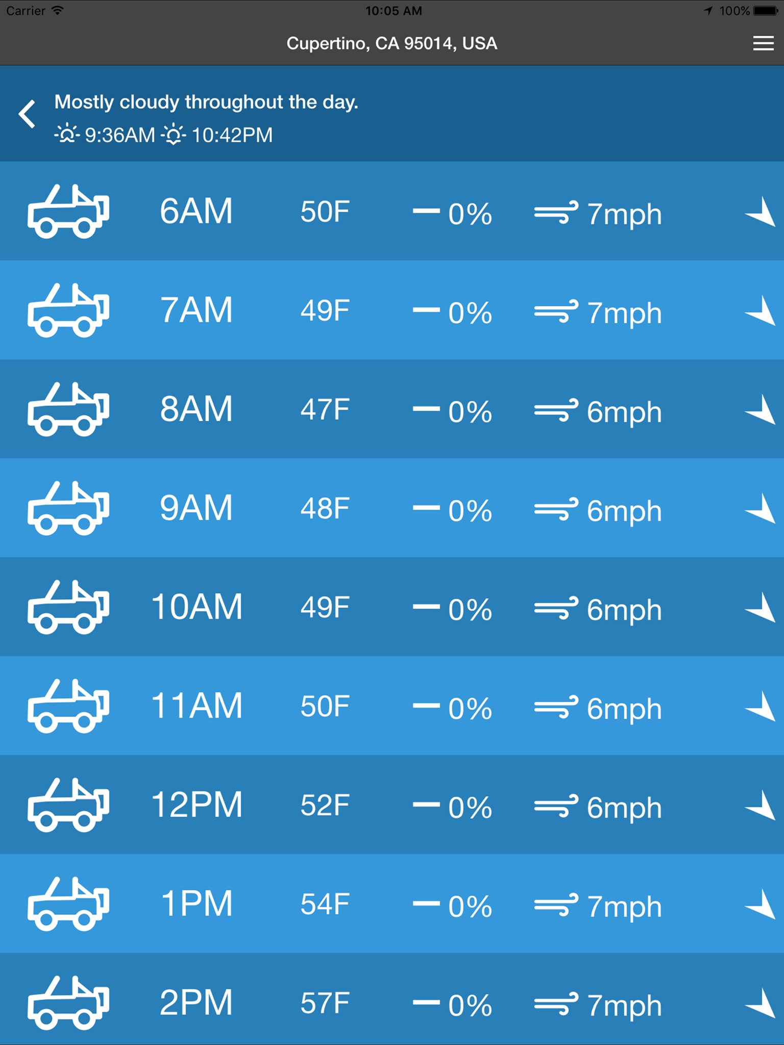 Jeep Weather is a simple app used to determine if the weather is good enough to drive with your top off based on your preferences. Set your preferred weather conditions for temperature, rain, wind and a Jeep with the top off icon is displayed if the weather is within those parameters, a top on icon is displayed otherwise.