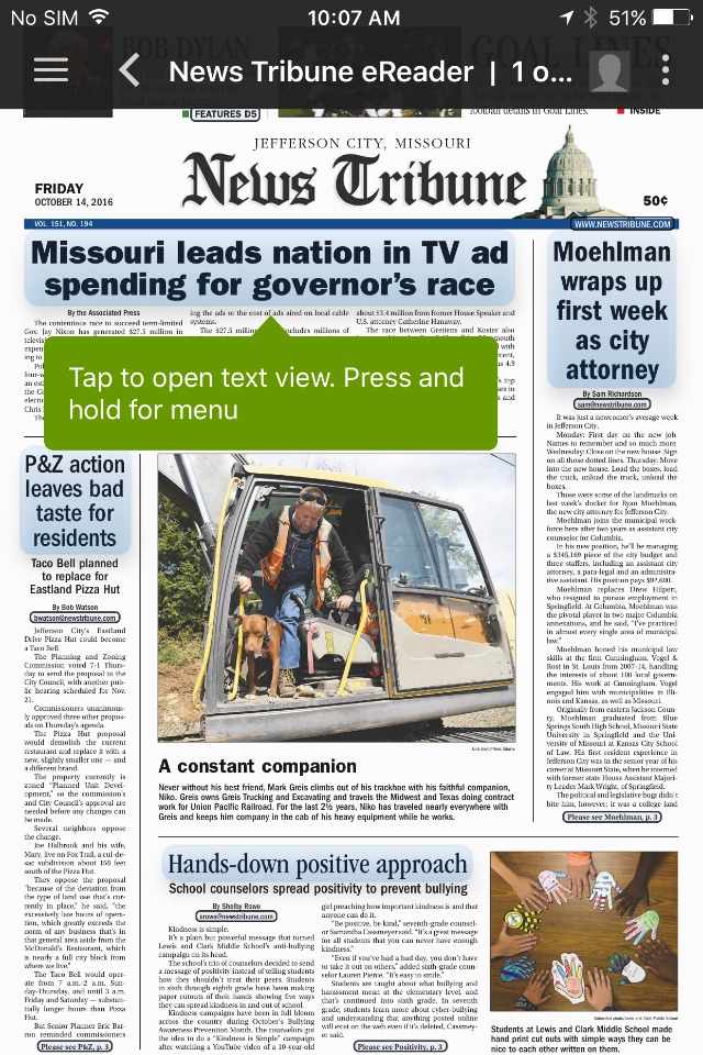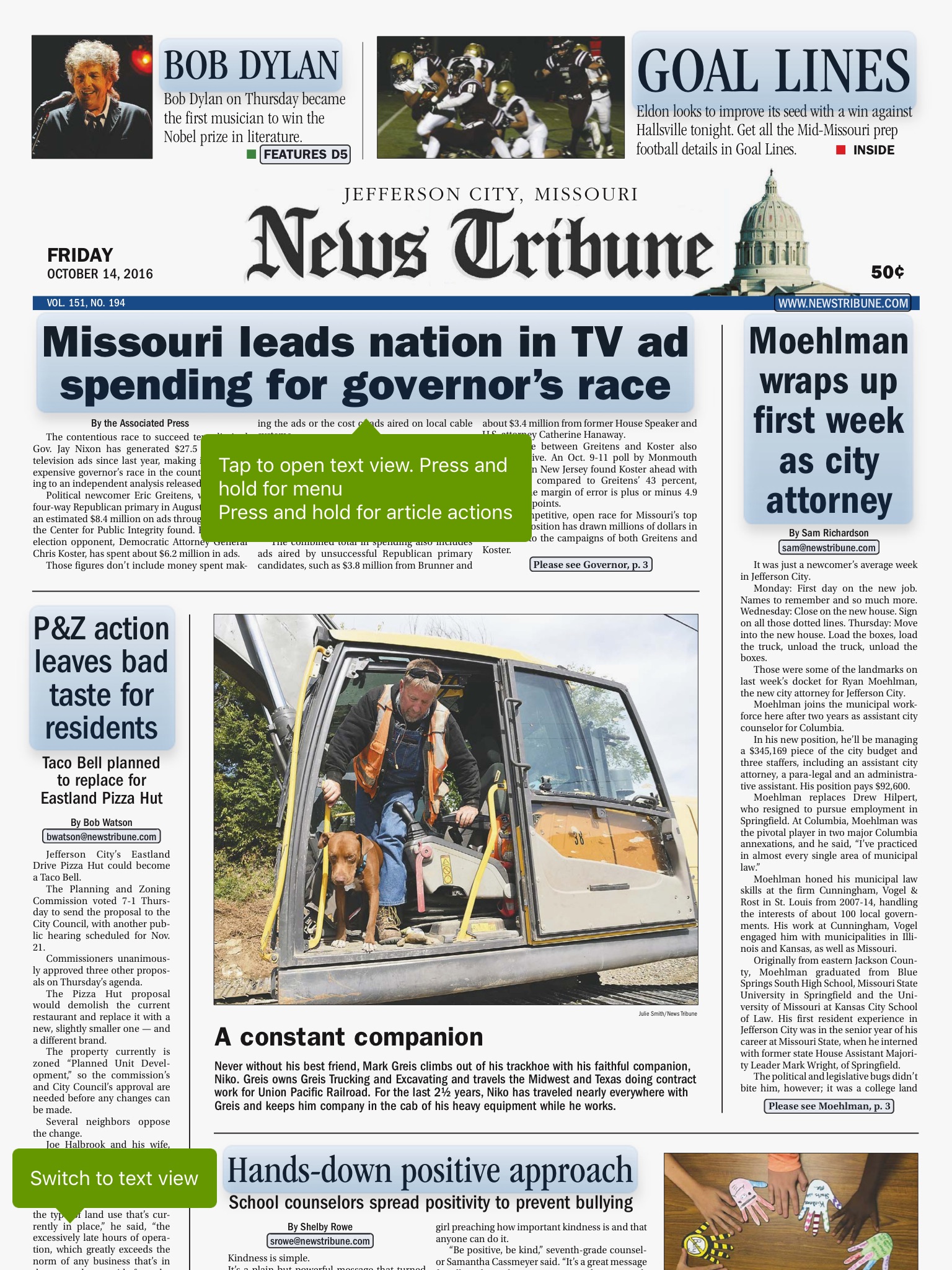 Get the latest news for Central Missouri from the Jefferson City News-Tribune. With the News Tribune app, you can view every section of the newspaper in a full-content digital replica. Easily read todays edition and share your favorite articles.