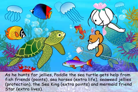Paddle the sea turtle hunts jellies on his way to visit his mermaid friend Star. But enemies like tiger sharks, killer whales, and scuba divers try to stop him. Help Paddle survive with assistance from sea horses, friendly fishes, protective seaweed jellies, and special appearances by Star and the Sea King.