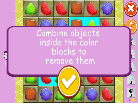 "Slide your finger through the jellies to combine them and complete missions. Your mission is remove the colorful tiles, each time you combine a jelly inside it, the tile color will change, continue to change it until it disappears. Be fast when the level is based in time and when the level is based in number of movements. Calculate exactly what movement will be the best."