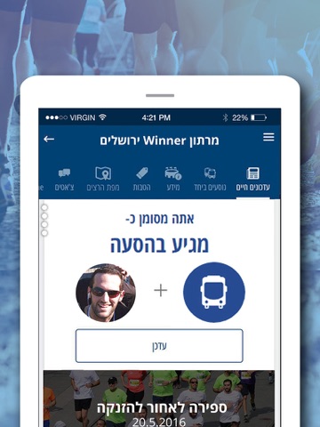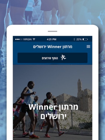 מרתון Winner ירושלים 2016 מגיע אליכם עם אפליקצייה יעודית ליום האירוע. כאן תמצאו את כל המידע הרלוונטי לרצים, תוכלו לראות מי עוד מגיע למרוץ, מה הדרך הכי נוחה להגיע, אילו הטבות מחכות לכם בדרך ומתי יוצאות ההסעות בהלוך ובחזור.