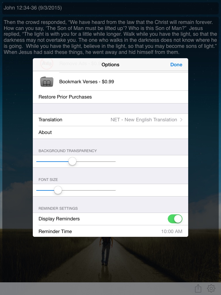 - A reminder feature is provided to enhance your daily experience. This reminder feature can be configured to display daily reminders at a time of your choosing each day to help you remain consistent your daily reading.