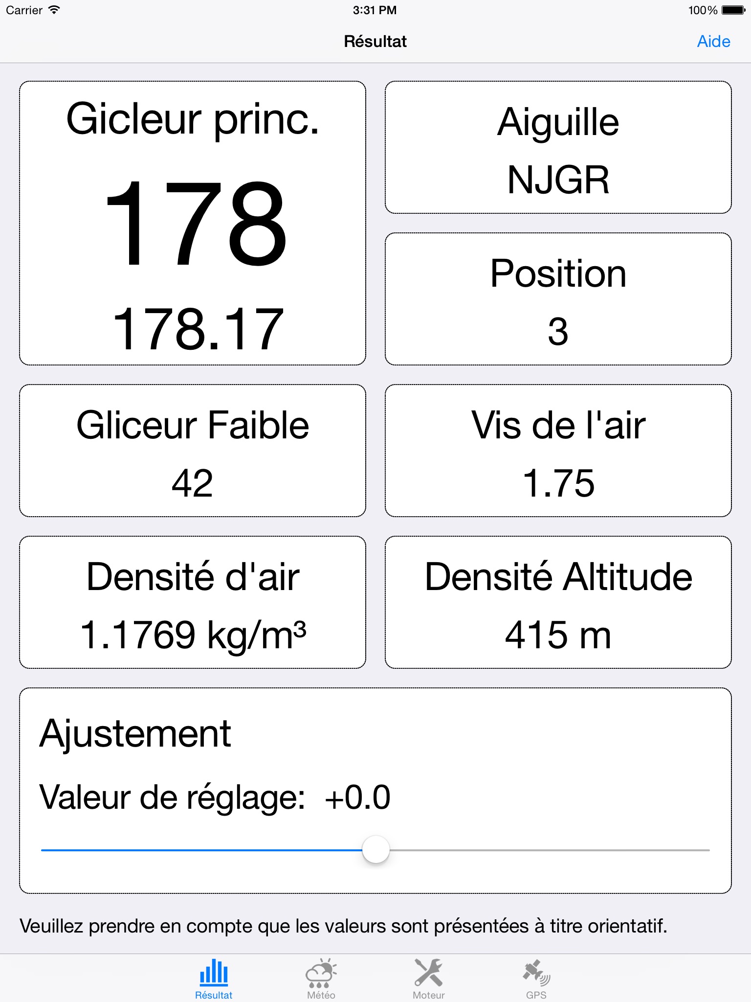 - Results: in this tab, the recommended main jet, needle type and clip position, slow jet and air screw position are shown. These data are calculated depending on the weather conditions and the engine configuration introduced in the next tabs. In addition, this tab lets to make a fine tuning adjustment to adapt to a concrete engine.