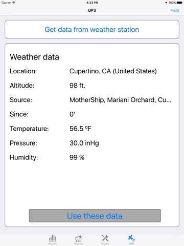 In order to get the weather values, the application can use the GPS to obtain the position and altitude, and the network connection to get the temperature, pressure and humidity from the nearest weather station. Nevertheless, the application can run without GPS and internet connection, in this case, the user has to give the weather data.