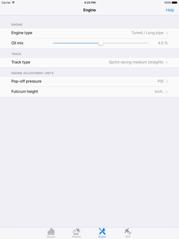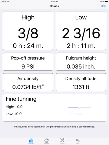 - Results: In this tab, a recommended jetting setup is shown. These data are calculated depending on the weather conditions and the engine and track configuration given in the following tabs. The following values are given: high needle, low needle, pop-off pressure and fulcrum arm height. Besides this jetting information, the air density and density altitude are shown too. In addition, this tab lets do a fine tunning adjustment for the high and low needles to adapt to the concrete engine. These values will be stored and used in the future sessions.