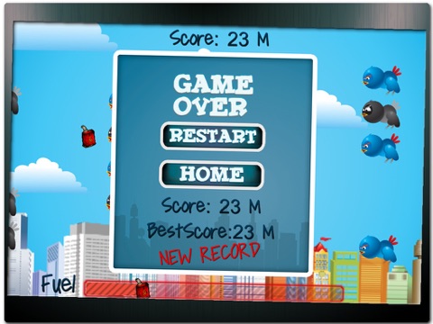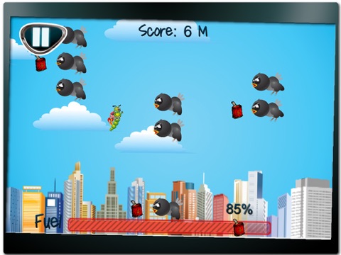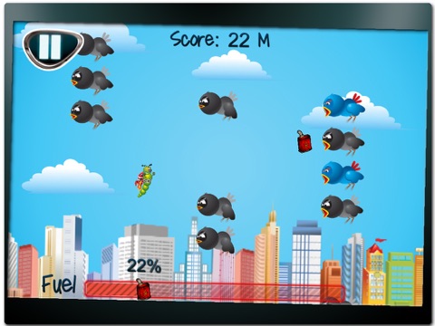Not only does he have to avoid getting eaten by the birds, but also overcome the risk of running out of fuel necessary in order to power his jetpack, and keep him from falling out of the sky. The game starts of easy, but dont be fooled! As the meter count increases, so does the difficulty. More birds, faster speed, and a surprise obstacle makes Jetty Freddy not only pleasantly challenging, but also unbearably addicting. So, whether youre looking for an intense gaming experience or simply a time waster, youre on the right page. This game is so simple, yet hard, fun and addicting. Oh, and just a word of advice... once you download this game, sit back, relax, and cancel all your plans, because once the birds attack theres no going back!