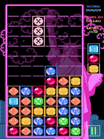 It then goes to the next level when the white column "X-X-X", falls on a jewel causing the removal of any of the same color; however, the same white column when falls on an empty part of the field makes getting a normal score. Finally, the game is over if only one column ends in the upper part of the field.