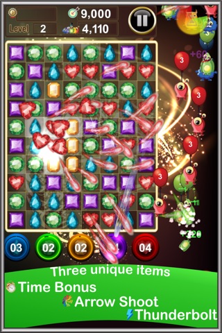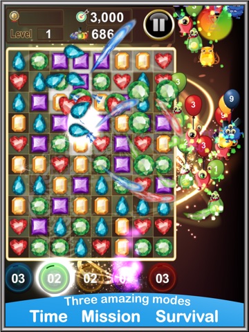 In Jewels Monsters Invasion, you are supposed to touch the match 3 jewels, but not "just any jewels". In very short time, youll have to decide to touch which jewels colors to bring you the best advantages.