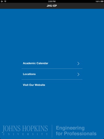 The Johns Hopkins University Engineering for Professionals (JHU-EP) App provides a quick and easy way for JHU-EP students to access academic calendar information and information on the EP Education Centers. The app is a universal app, which means that it will work on the iPhone, iPod Touch and iPad.