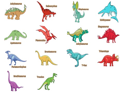 Ankylosaurus, Deinonychus, Dilophosaurus, Ichthyosaur, Apatosaurus, Pteranodon, Ankylosaurus, Stegosaurus, Parasaurolophus, Brontosaurus, T-Rex, Triceratops, Brachiosaurus, Troodon.