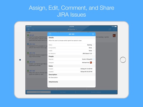 - Assign tickets and transition them through your JIRA workflow. Just drag tickets with your finger, its that easy.