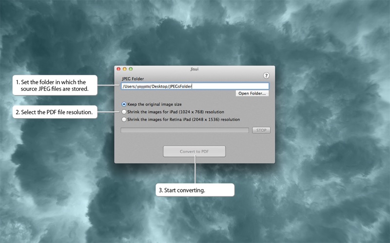 Jisui is a Mac app that quickly converts large numbers of JPEG files into a PDF document. It is particularly well suited to creating a PDF document containing several hundred pages of scanned images. You can improve the browsability and portability of the PDF files it creates by reducing image resolution to one of two iPad resolutions.