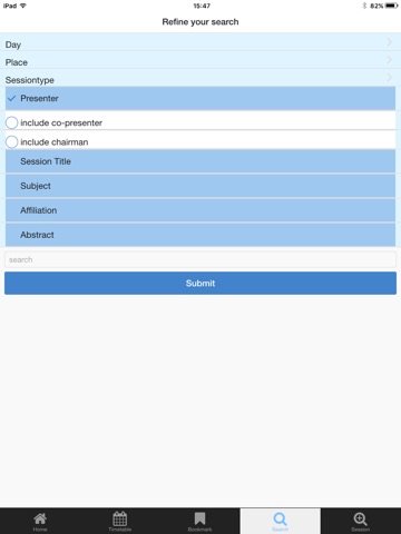 Search specific programs based on the session type, the presentation title, author name, and institutions.
