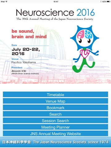 This App is for searching and browsing all programs in the 39th Annual Meeting of Japan Neuroscience Society (JNS 2016), which is held from July 20 to 22, 2016 at Pacifico Yokohama, Japan.