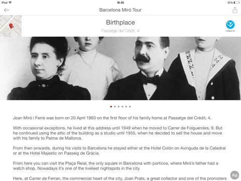This is a mobile application created by the Fundació Joan Miró in Barcelona. We propose an approximation to some of public works by Joan Miró and the possibility of exploring Barcelona by touring the places in which the artist lived.