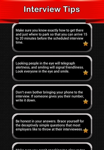 Are you looking for the best collection of Interview Tips for your mobile device? This app is filled with good interviewing tips, tips for job interviews, phone, group, college and more. Learn the techniques you need use to impress your future employer and make sure you get a second interview or get the job. Dont wait until the last minute to prepare, if you want to be successful and get the job on the first try you need to know how to dress, what to say, how to act and compose yourself. Be prepared for the questions you will be asked, stay relaxed and answer honestly. Download and install this free interview tips app and get the confidence you need to have a good interview and get the job you worked so hard for.