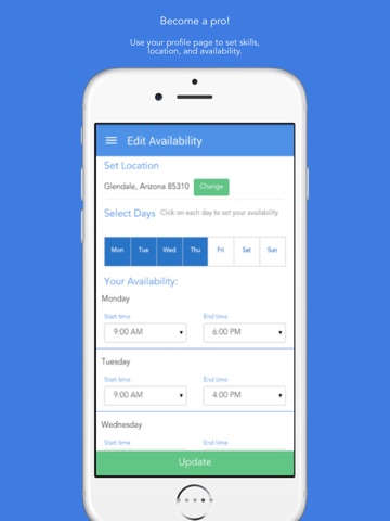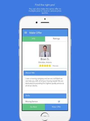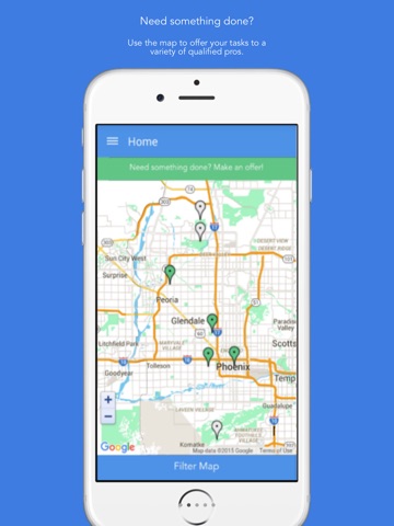 As a user creating a task, you will see the map as your home screen. From there, you will be able to filter the service you are looking for and find qualified pros in your area. Once you make an offer to one pro, you can remake that same offer to any number of pros to see a variety of price quotes.
