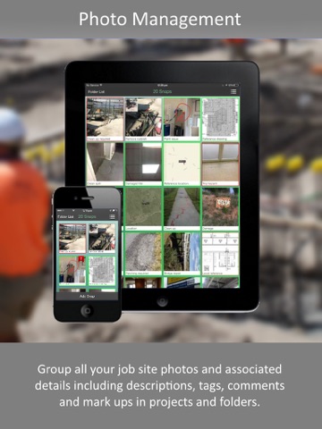 JobSnaps provides a simple, flexible and efficient tool to take, date time stamp, organize, annotate and markup project site photos and then create PDF photo reports that can be easily and quickly distributed to the project team.