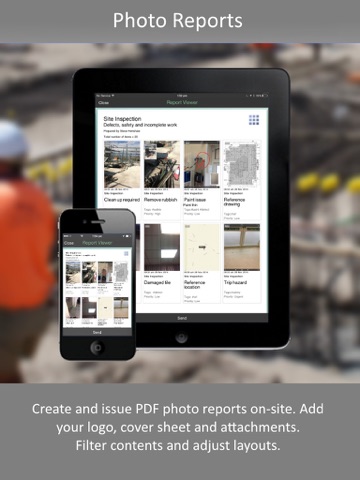 Using the report building tool you can quickly produce detailed PDF photo reports that can be immediately emailed from the project site, shared using a web link or exported to other systems such as Word and Excel. Using #tag, description, responsible and folder filtering you can specify which photos are included in your reports. You can also include your company logo, a cover sheet, notes page, attachment documents and a location overview to reports.