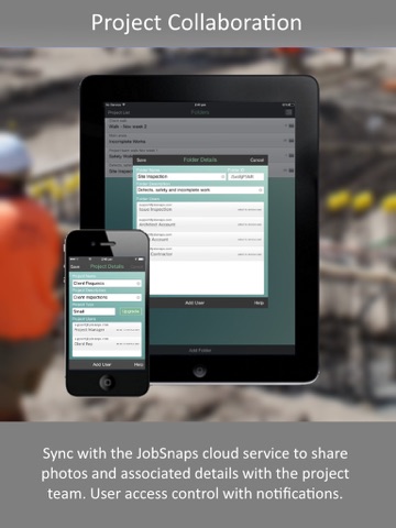 You can keep the entire project team up to date by syncing projects and folders using the JobSnaps cloud service. This provides multiple user and multiple company access across devices with full control over user access rights to individual projects and folders.