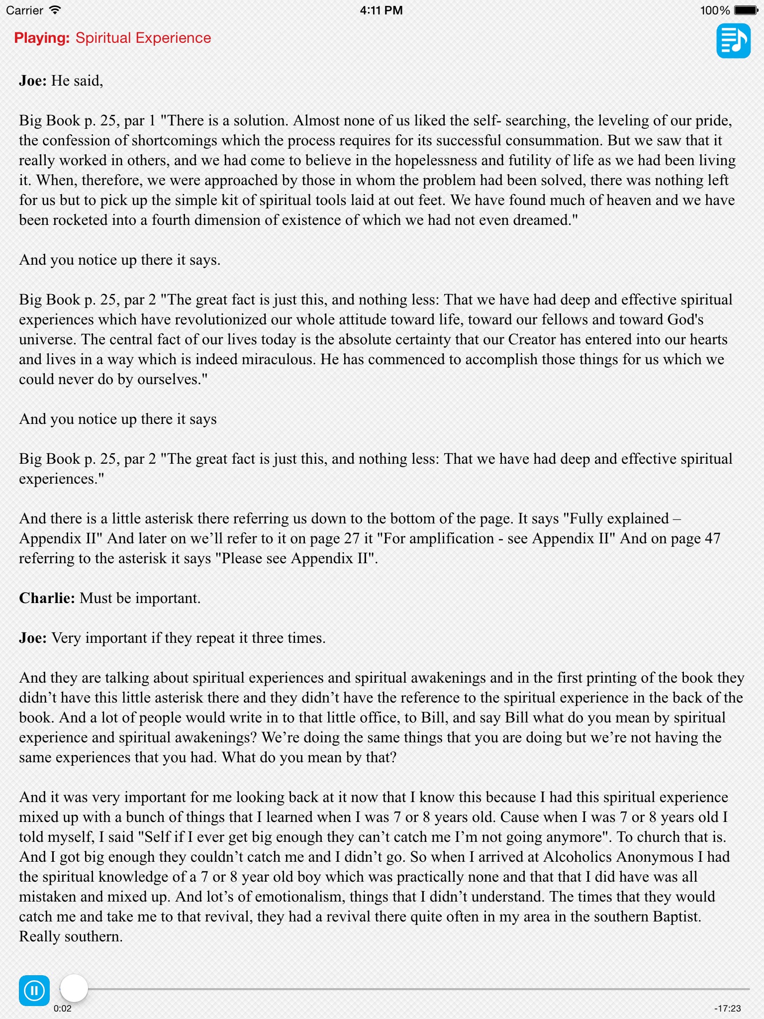 This app is perfect for a Big Book Study! I love how its divided up and that it has text to go along with. Joe and Charlie have taken my recovery to a whole new & better level!!!!