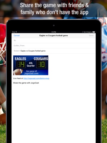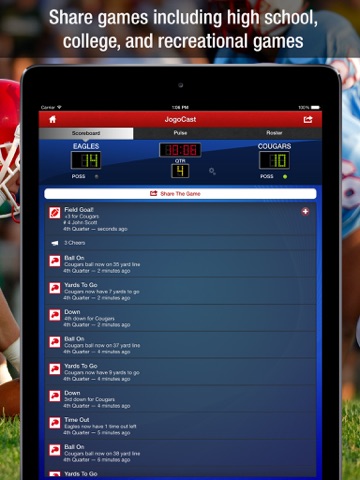 From high school football games to local recreational football leagues, JogoCast connects you and other football fans. JogoCast is a fast and fun way to share your favorite football moments with your friends and family in real-time.