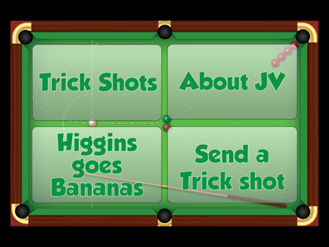 The free app contains 2 introductory trick shots from JV and an amazing banana shot from Alex ‘Hurricane’ Higgins. Further editions available for in-app purchase are only £0.69p per bundle of 3 trick shots and only £3.99 per bundle of 21 trick shots. Edition 14 is the Alex ‘Hurricane’ Higgins Special Edition. Amazing Value so please tell your friends.