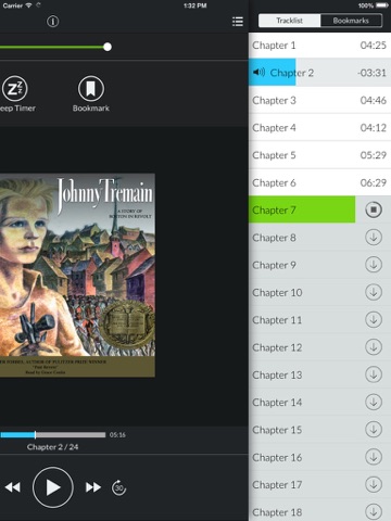 Download your book directly over Wi-Fi or cellular network and begin listening as soon as the first track downloads. The Downpour.com powered app features an attractive interface with traditional audio controls in addition to sleep timer, bookmarking, and variable track scrubbing.