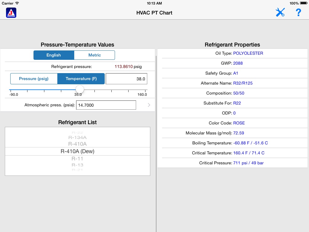 2. HVAC PT Chart: This module is an electronic pressure-temperature (PT) look-up chart that allows you to specify the exact refrigerant temperature/pressure and view the corresponding pressure/temperature value. It also displays a complete list of pressure/temperature values in 1 degree increments for over 100 different refrigerants (including azeotropic refrigerants with both dew and bubble versions). You can adjust the elevation so proper gauge pressures are displayed. Additional functionality includes the ability to display specific refrigerant properties and email the entire PT chart list for a specific refrigerant.