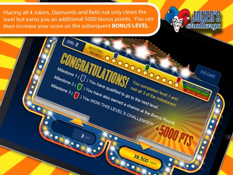 Gameplay ends if you happen to draw a Bell, Diamond or Joker and DO NOT have an open space on the game board grid to place it. However, keep in mind that just because gameplay has ended, that doesn’t necessarily mean that your game is over. Joker’s Challenge offers unlimited levels and a clever milestones feature that affords you boundless opportunities to boost your score and to enjoy extended play.