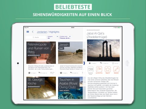 Entdecke die schönsten Orte mit dem Jordanien tripwolf Guide - deinem Reiseführer mit Offline Karte! Lerne Jordanien schon vor der Ankunft kennen und plane deine Reise, um garantiert das Beste aus deinem Urlaub herauszuholen. Dank Offline Karte benötigst du unterwegs keine Internetverbindung und hast trotzdem alles dabei, was du brauchst.