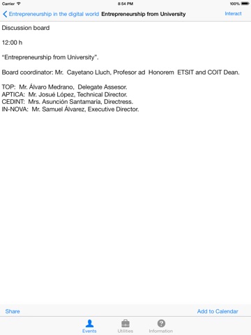 From this section you will be able to see in a clear and clean interface the different conferences and events that will take place. Selecting one of them will direct you to a view with information about who will participate in that particular event and what it will be about. From there you will be able to: