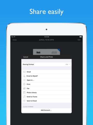 * Upload to Dropbox, Google Drive, Box, OneDrive, OneNote, Evernote, iCloud, and more