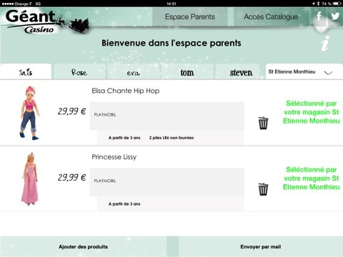 Les parents disposent d’un espace dédié pour s’informer sur les Jouets de Noël, de leur disponibilité dans le magasin le plus proche et du prix du jouet. Ils peuvent également consulter les listes de leurs enfants et